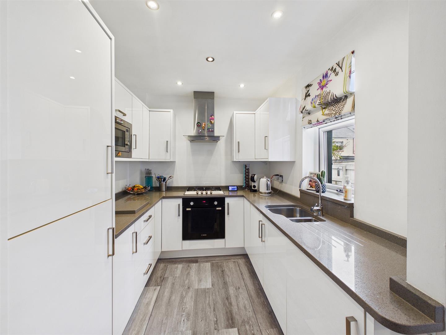 The contemporary kitchen is fitted with a comprehensive range of units complemented by stylish Quartz worktops. Integrated appliances include oven, gas hob with chimney hood, washing machine and fridge freezer, offering both practicality and sleek design.