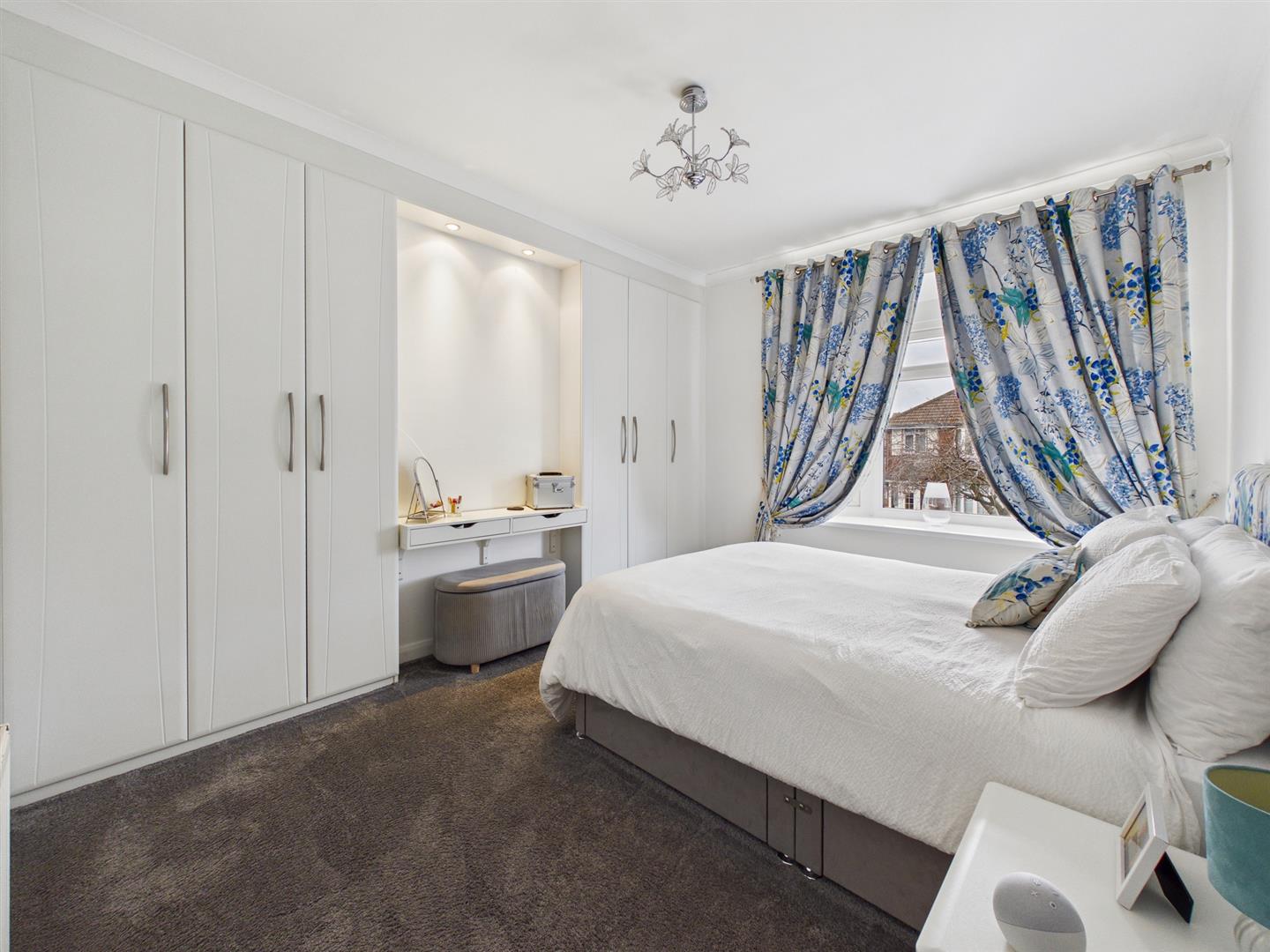 Upstairs, there are three well-presented bedrooms, two with fitted wardrobes. The family bathroom is beautifully appointed, comprising a walk-in shower, separate bath, washbasin, and low-level WC, finished to a high standard.