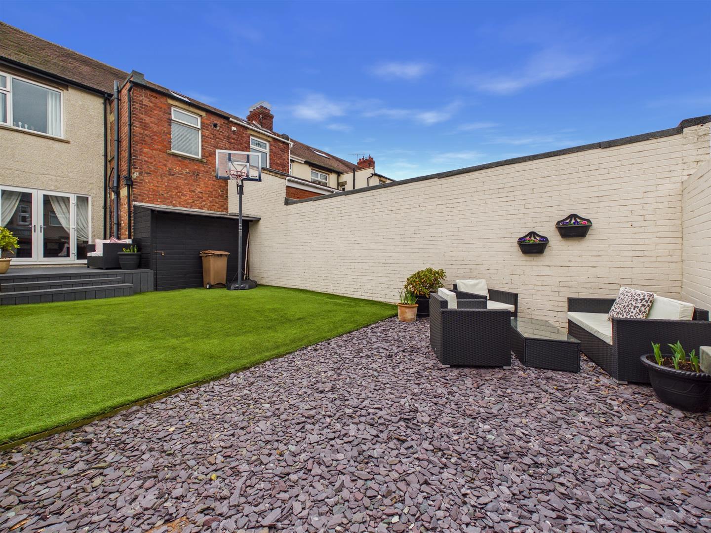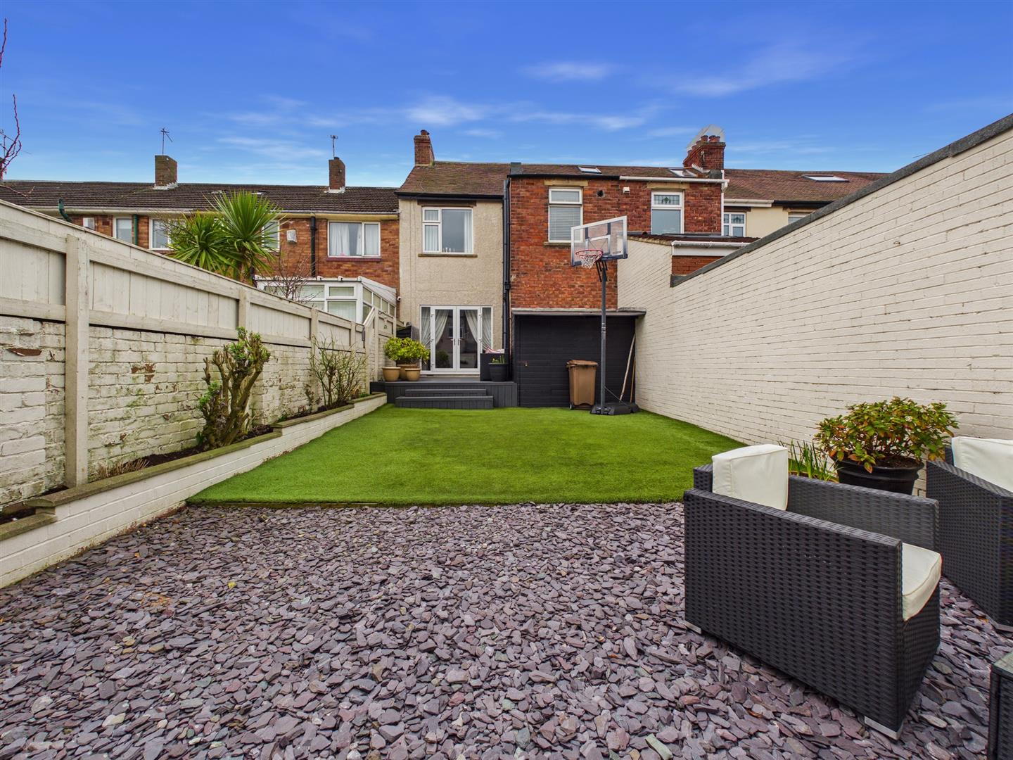 Externally, the property boasts an attractive rear garden designed for low maintenance and enjoyment, with artificial lawn, decking, patio area, and double gates providing access to the rear lane.