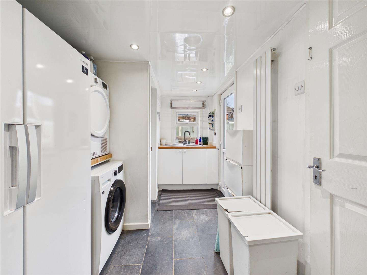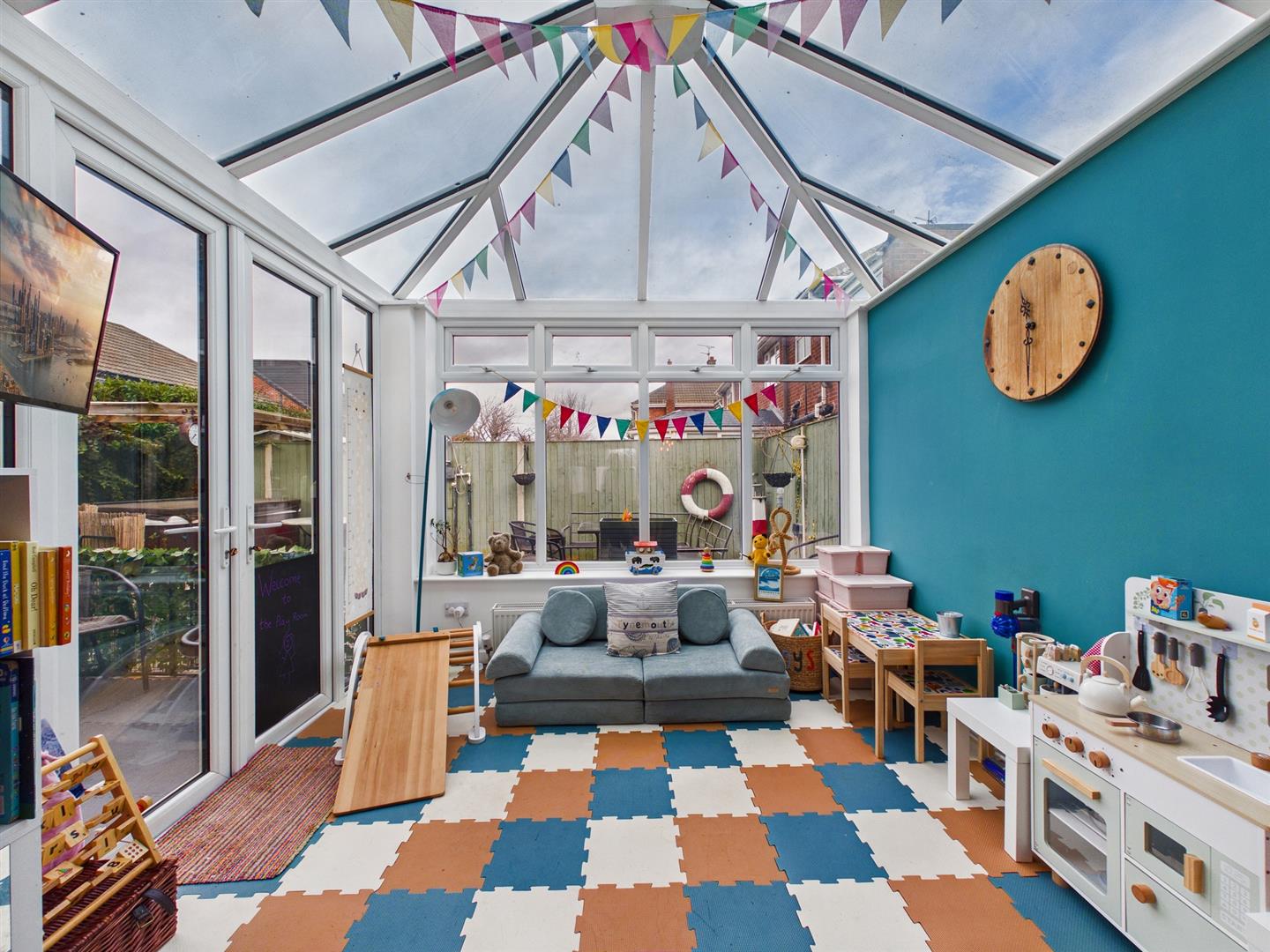 The kitchen flows into a conservatory overlooking the rear garden, offering additional versatile living space that can be used as a second sitting area, playroom or home office. A separate utility room provides space for appliances and extra storage, and a downstairs WC completes the ground floor.