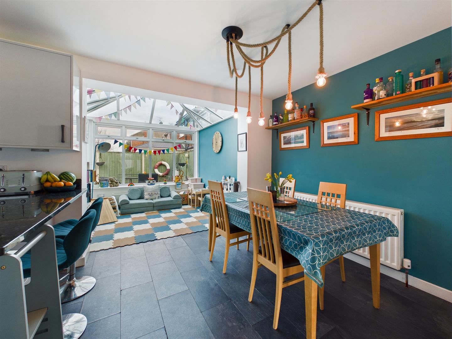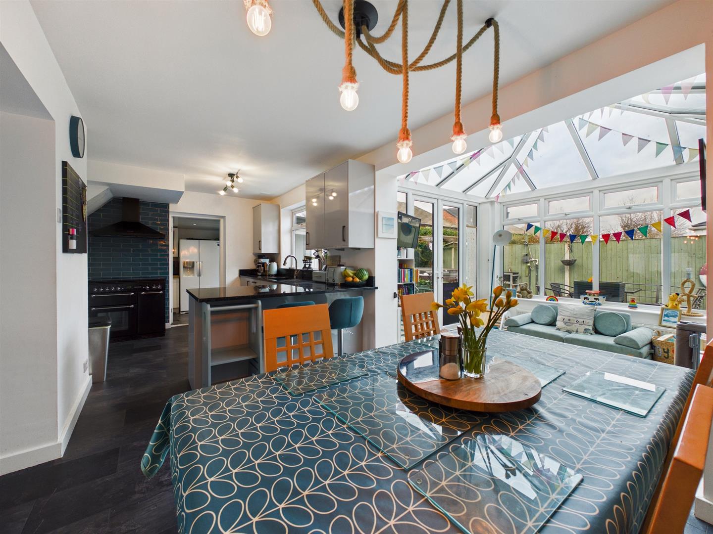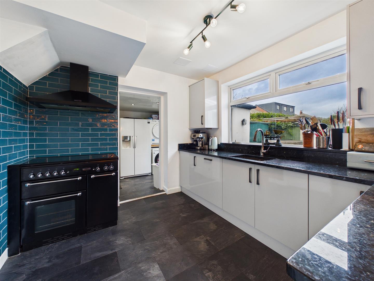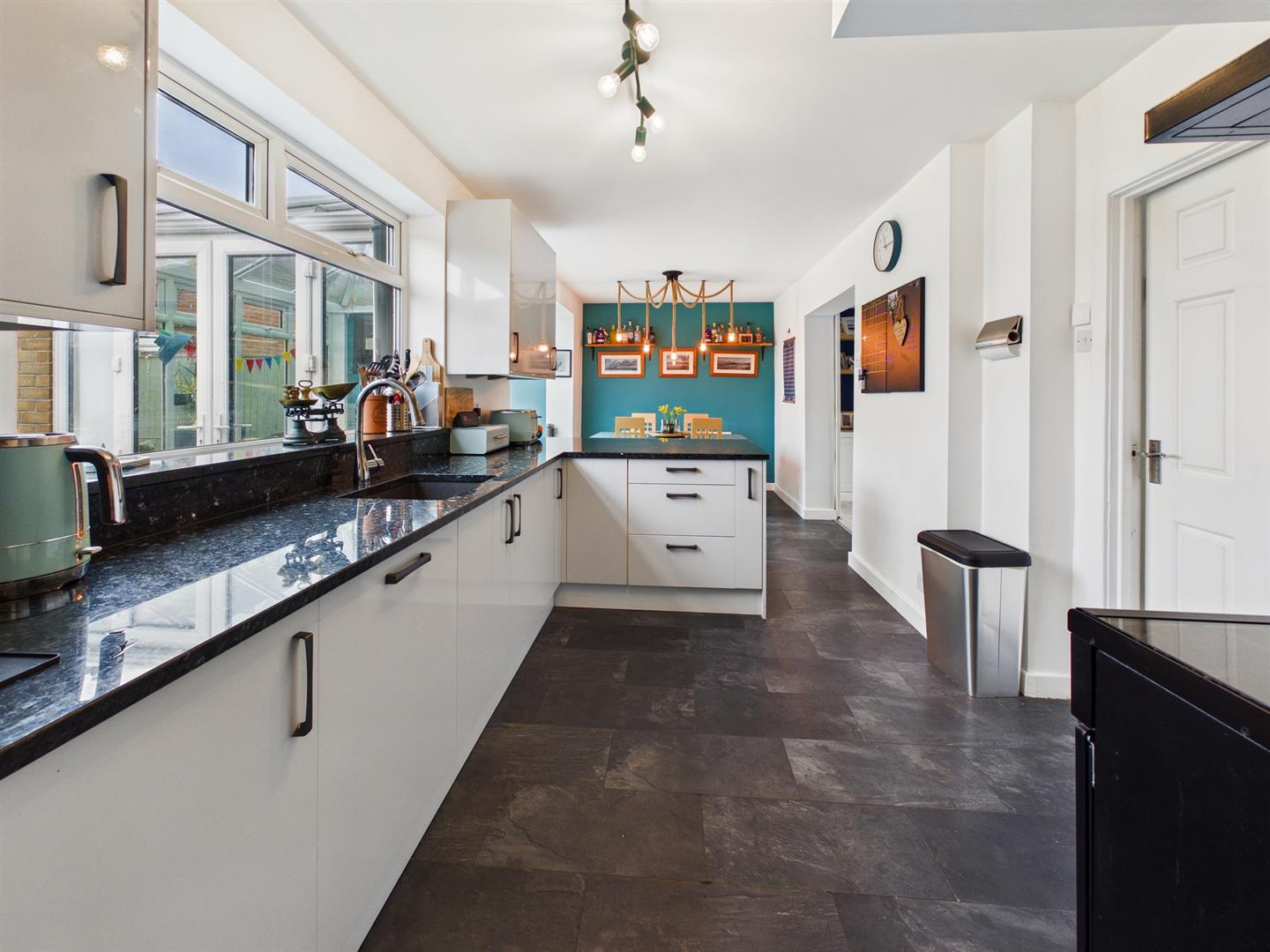 To the rear is the open-plan dining kitchen, forming the heart of the home. This impressive space features a wide range of fitted units with granite worktops and ample preparation space. There is space for a range oven with chimney hood above, and the layout comfortably accommodates a dining table, creating a sociable setting for everyday meals and gatherings.