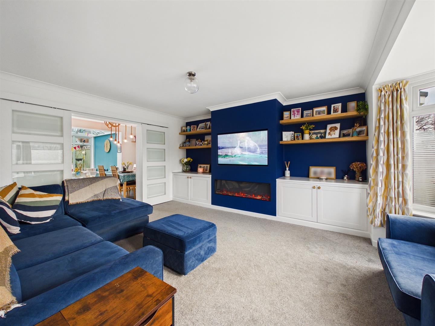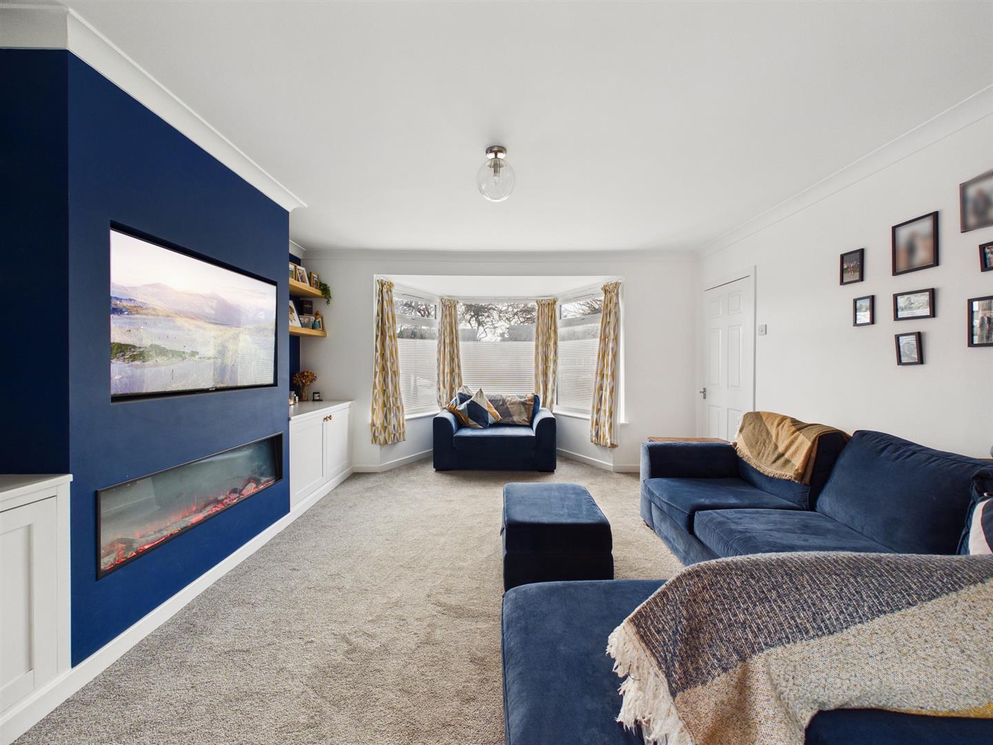 The property benefits from appealing kerb appeal, with a front garden and driveway providing off-street parking and access to the attached garage. Inside, a welcoming hallway leads to the main reception room with a contemporary media wall with feature fire and low-level cupboards creates a striking focal point while providing useful storage.