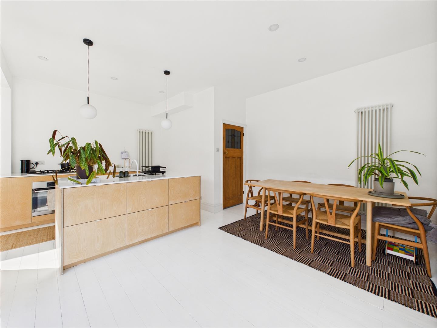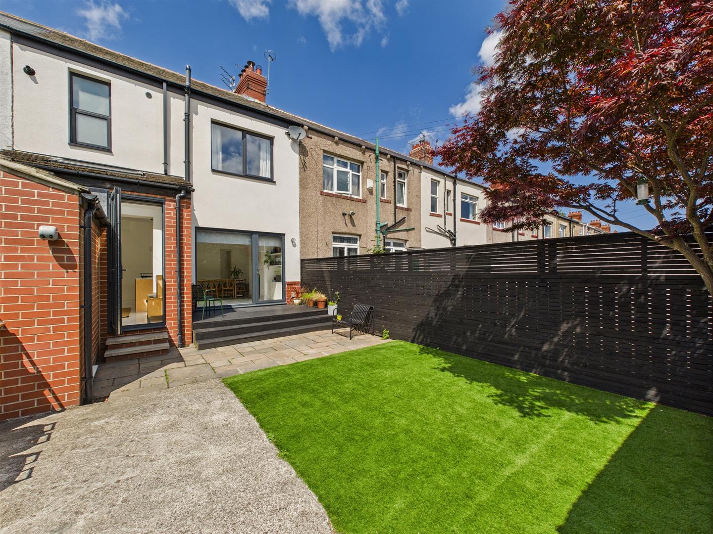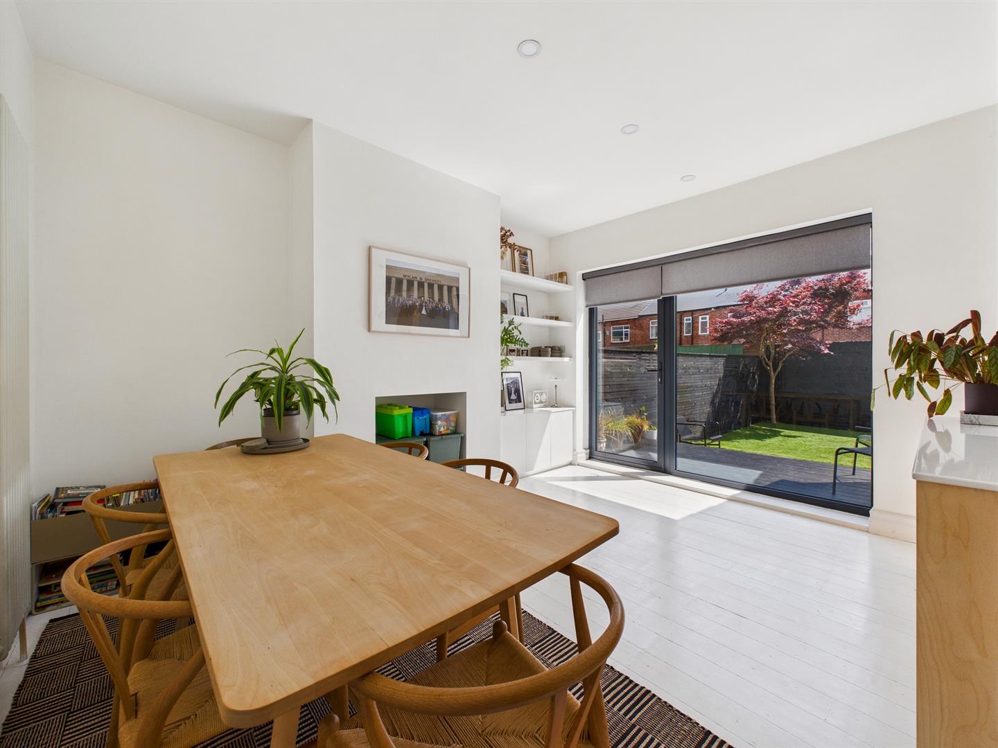 With over 1100 square feet of accommodation set over two floors, this interior designed property consists of a vestibule with door incorporating period stained glass leading to the spacious entrance hallway which has stairs up to the first floor and doors to the reception room, dining kitchen and downstairs WC. The light and elegant reception room has a beautiful bay window with period stained glass upper panes, a period cast iron fireplace and built in recess cupboards. The fabulous and extended dining kitchen easily accommodates a six seater dining table as well as an Island layout and built in cupboards and shelves to one recess. Benefitting from an impressive range of contemporary units with stone worktops and integrated appliances including oven, gas hob and fridge freezer. The island incorporates not only base units and the sink but also the dishwasher and washing machine. The dining area includes a picture window and door giving access to the rear garden and providing an abundance of natural light. To the first floor there are three stylish bedrooms, all with fitted wardrobes and two with period cast iron fireplaces. The beautiful family bathroom has a stone bath with central mixer tap, walk in rainfall shower, countertop washbasin, integrated WC and a period stained glass internal window. Externally there is a low maintenance front garden and a rear garden with artificial lawn, patio, raised decking, an outbuilding with power and a garage door providing off street parking.