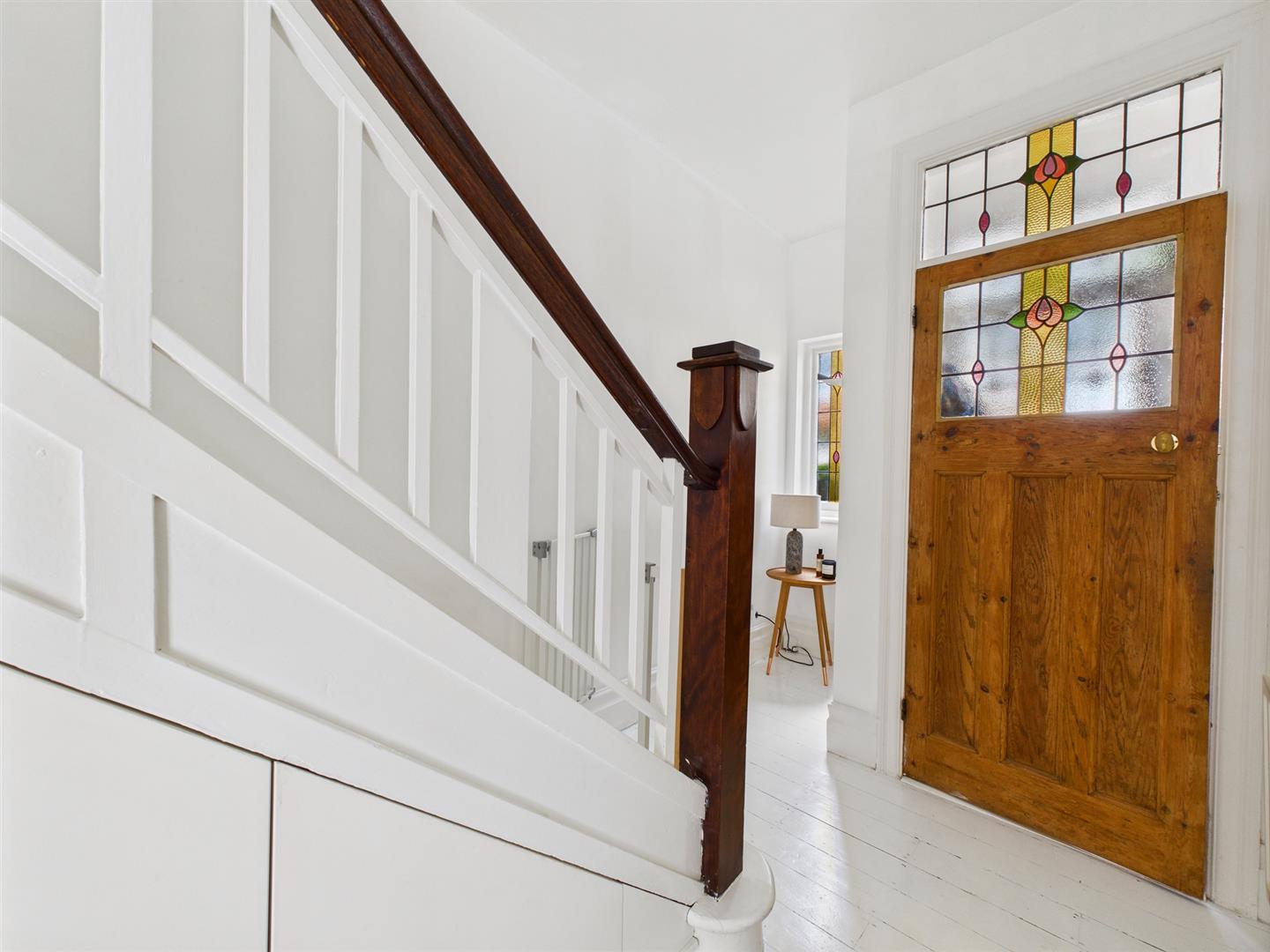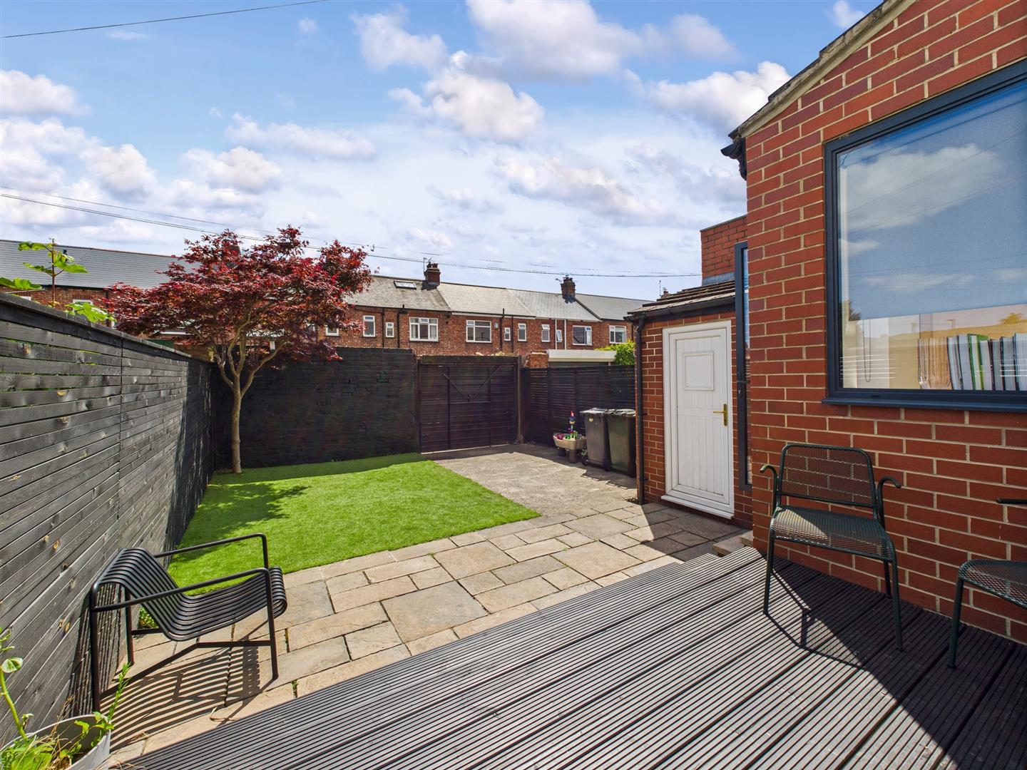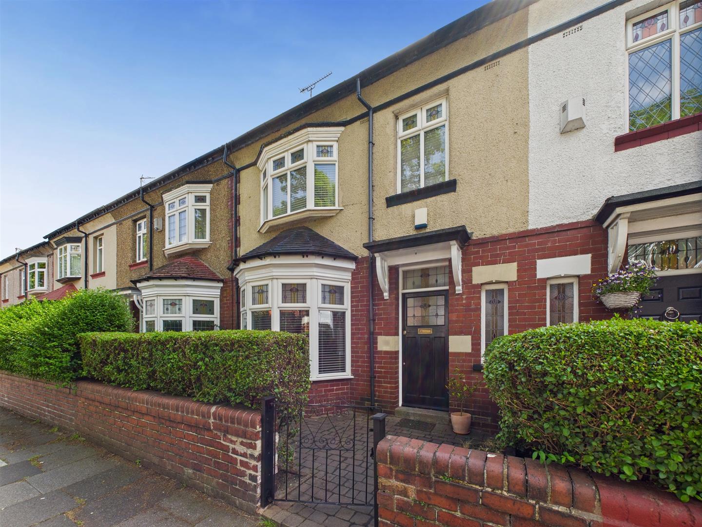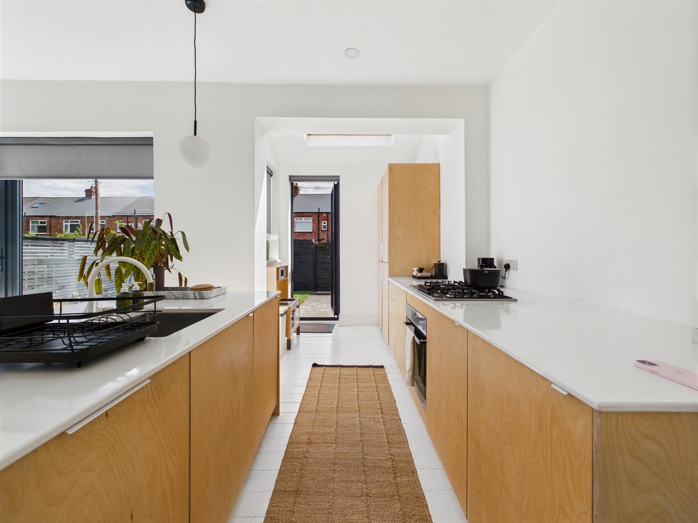 With over 1100 square feet of accommodation set over two floors, this interior designed property consists of a vestibule with door incorporating period stained glass leading to the spacious entrance hallway which has stairs up to the first floor and doors to the reception room, dining kitchen and downstairs WC. The light and elegant reception room has a beautiful bay window with period stained glass upper panes, a period cast iron fireplace and built in recess cupboards. The fabulous and extended dining kitchen easily accommodates a six seater dining table as well as an Island layout and built in cupboards and shelves to one recess. Benefitting from an impressive range of contemporary units with stone worktops and integrated appliances including oven, gas hob and fridge freezer. The island incorporates not only base units and the sink but also the dishwasher and washing machine. The dining area includes a picture window and door giving access to the rear garden and providing an abundance of natural light. To the first floor there are three stylish bedrooms, all with fitted wardrobes and two with period cast iron fireplaces. The beautiful family bathroom has a stone bath with central mixer tap, walk in rainfall shower, countertop washbasin, integrated WC and a period stained glass internal window. Externally there is a low maintenance front garden and a rear garden with artificial lawn, patio, raised decking, an outbuilding with power and a garage door providing off street parking.