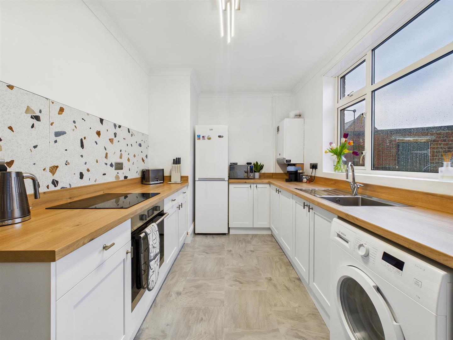 With over 640 square feet of accommodation on offer this property is within a fabulous location and has a superb layout throughout. The entrance hallway leads to all rooms with one spacious reception room with bay window, fabulous contemporary kitchen with a range of wall, base and drawer units, contrasting worktops, single oven with four ring induction hob. There are two stylish bedrooms, one with a bay window and a beautiful bathroom benefitting from a walk in rainfall shower, vanity wash basin and low level WC. Externally there is a front garden and a secluded rear garden with outhouse.